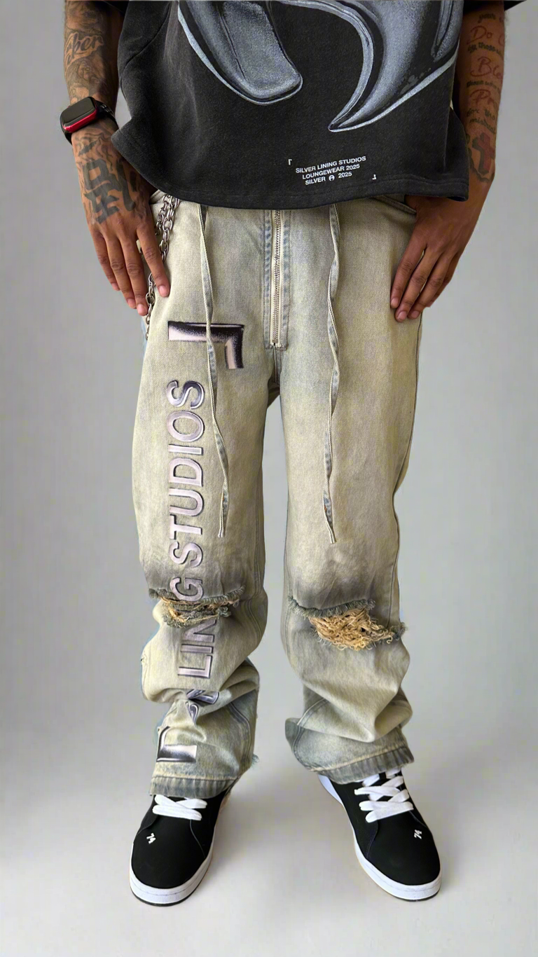 Bold baggy denim with a worn effect guaranteed to be a unique addition to your wardrobe